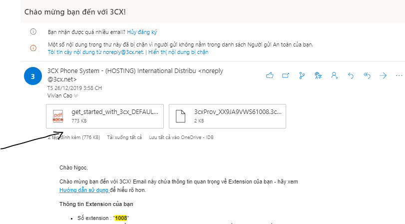 KH check email và làm theo hướng dẫn để cài đặt extension vào thiết bị nghe gọi (máy tính, di động, IP Phone) => xem hướng dẫn trong email tự động tiêu đề " welcome to 3CX phone system hoặc:
